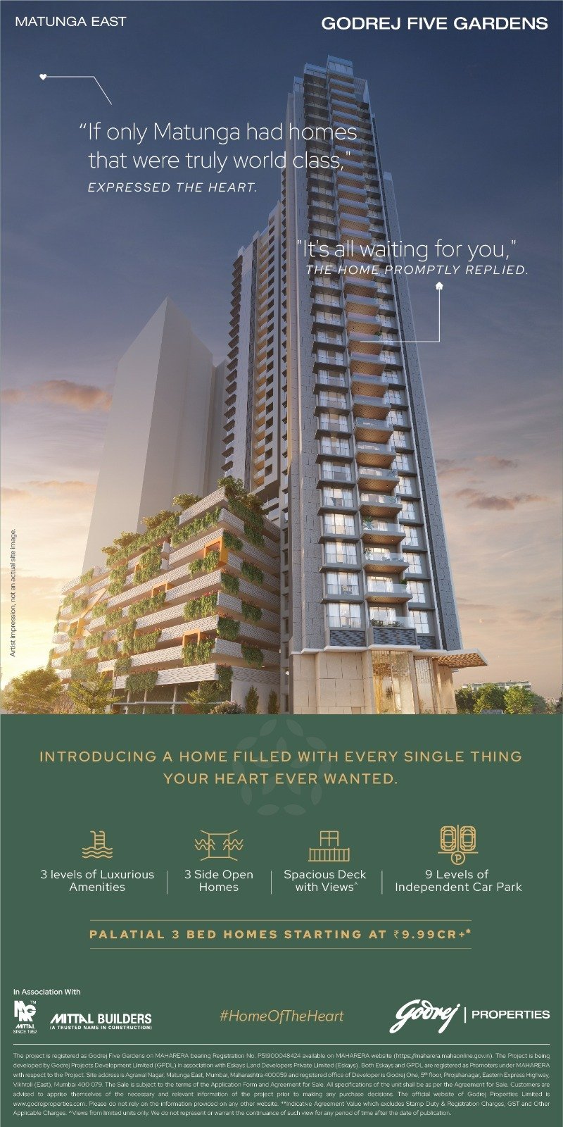 Welcome to Godrej Five Gardens - the home your heart has always cherished.From connectivity to convenience, from lush greens to lavish amenities, from thoughtfully designed homes to iconic landmarks, everything that your heart desires is here. Created to give you exactly what your heart desires, Godrej Five Gardens promises an exquisite lifestyle in the heart of the city. So come, follow your heart to Matunga's new residential landmark with indulgences that are truly heartfelt.